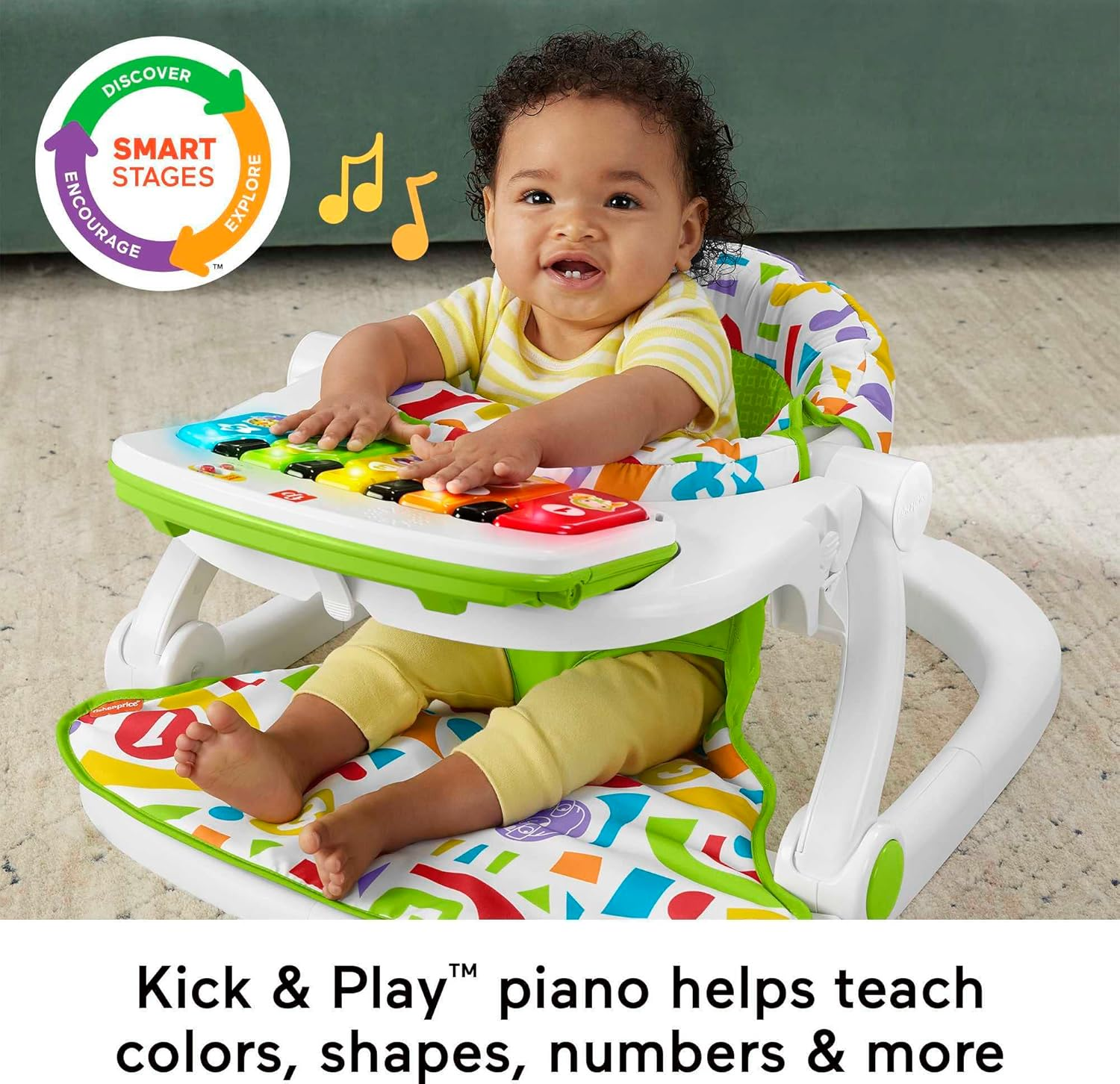 • O brinquedo de piano Kick & Play tem luzes, música e 3 níveis de aprendizagem Smart Stages para brincadeiras de recém-nascidos a crianças pequenas